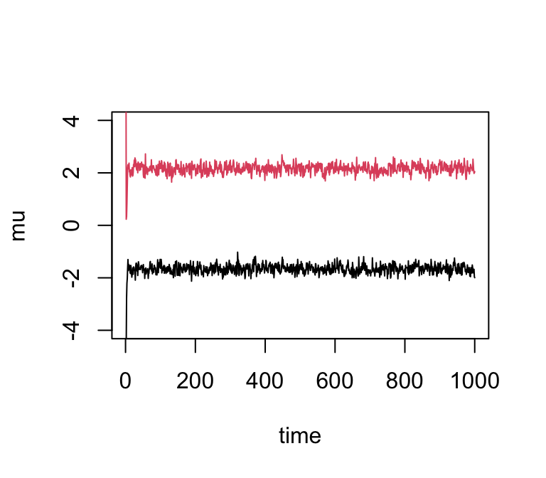 plot(res2$mu[,1],ylim = c(-4,4),type = "l",xlab = "time",ylab = "mu")