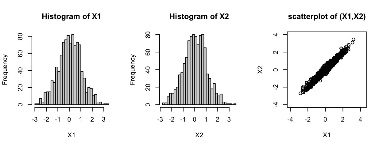 The following code illustrates this: the histograms illustrate both \(X_1\) and \(X_2\) are normal, and the scatterplot of \(X_1\) and \(X_2\) shows they are correlated (and the sample correlation is approximately 0.98).